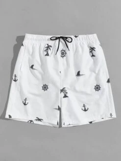 Men Allover Print Patched Detail Drawstring Waist Swim Trunks
