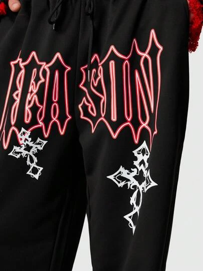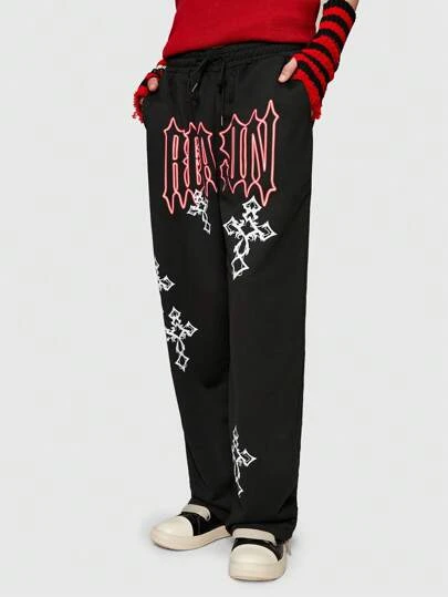 Grunge Punk Guys Cross Letter Graphic Drawstring Waist Sweatpants