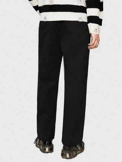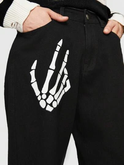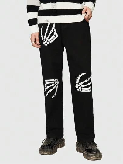 Grunge Punk Guys Skeleton Hand Print Straight Leg Jeans