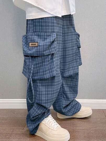 Manfinity EMRG Men Plaid Print Letter Patched Detail Flap Pocket Side Cargo Pants