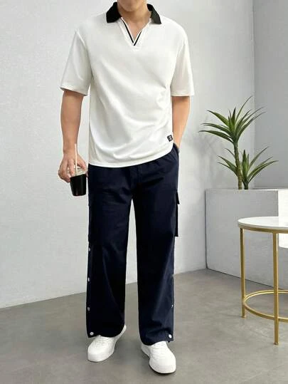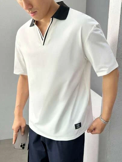 Manfinity Hypemode Men Contrast Collar Letter Patched Detail Drop Shoulder Polo Shirt