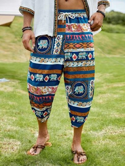 Manfinity RSRT Men Geo & Elephant Print Drawstring Waist Capri Pants