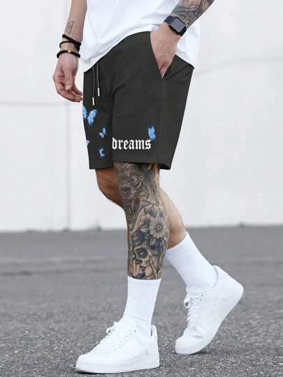 Men Butterfly & Letter Graphic Drawstring Waist Shorts