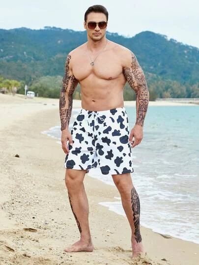 Men Cow Print Drawstring Waist Swim Trunks