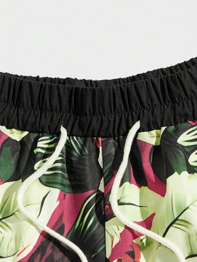 ROMWE Guys Tropical Print Striped Trim Drawstring Waist Shorts