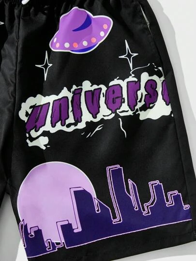 ROMWE Street Life Guys Cartoon & Letter Graphic Drawstring Waist Shorts