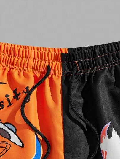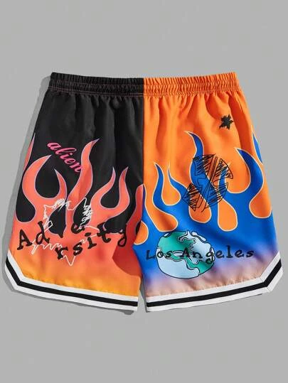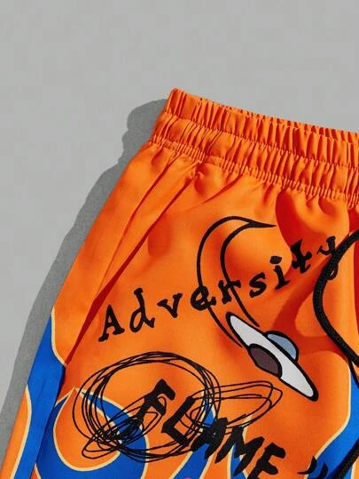 ROMWE Street Life Guys Fire Letter Graphic Striped Trim Drawstring Waist Shorts