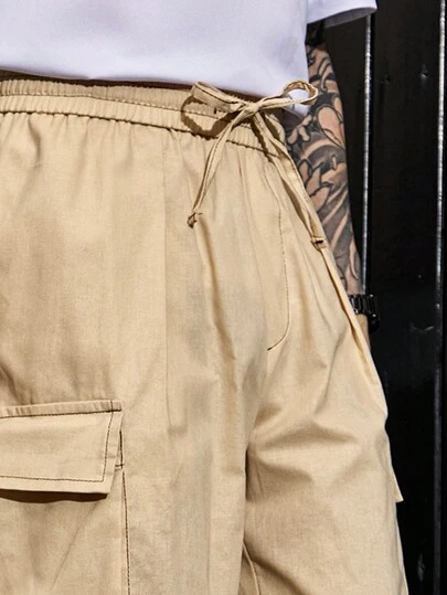 SHEIN Men Cotton Flap Pocket Side Drawstring Waist Cargo Shorts